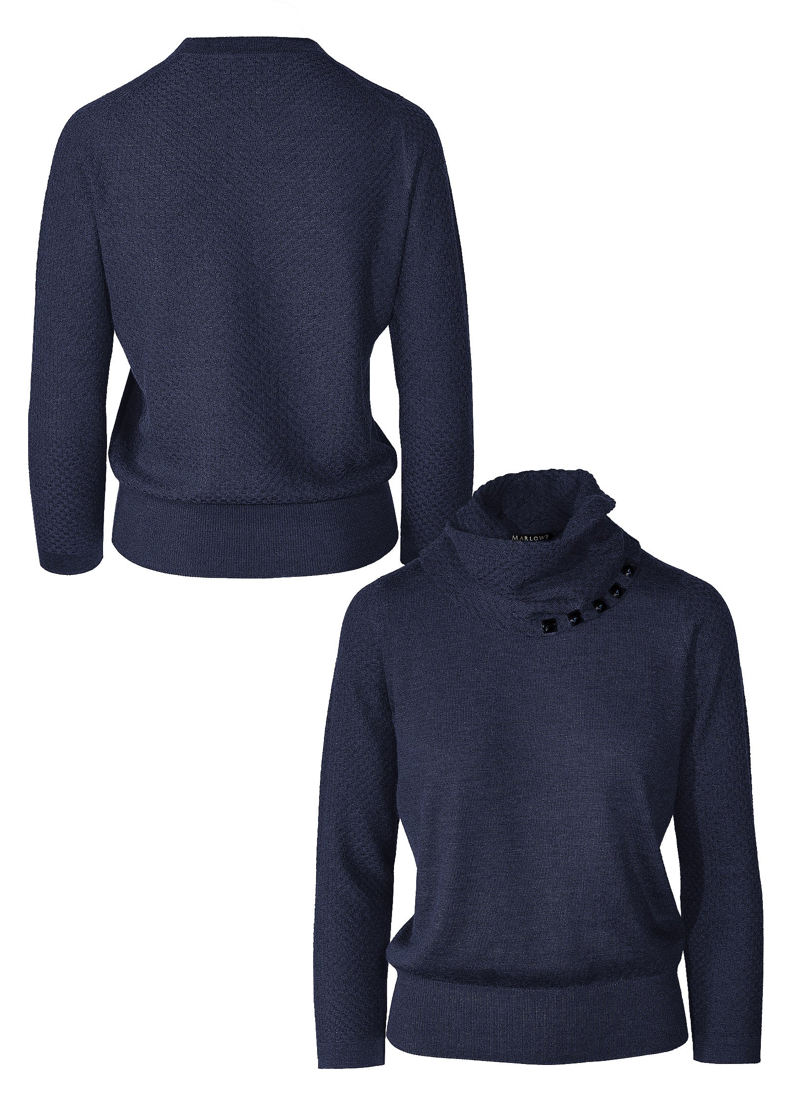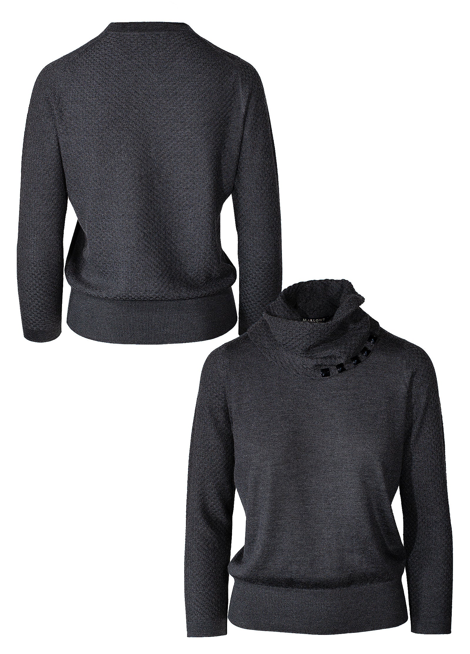 • quadrato texture stitch design back body, sleeves and funnel scarf