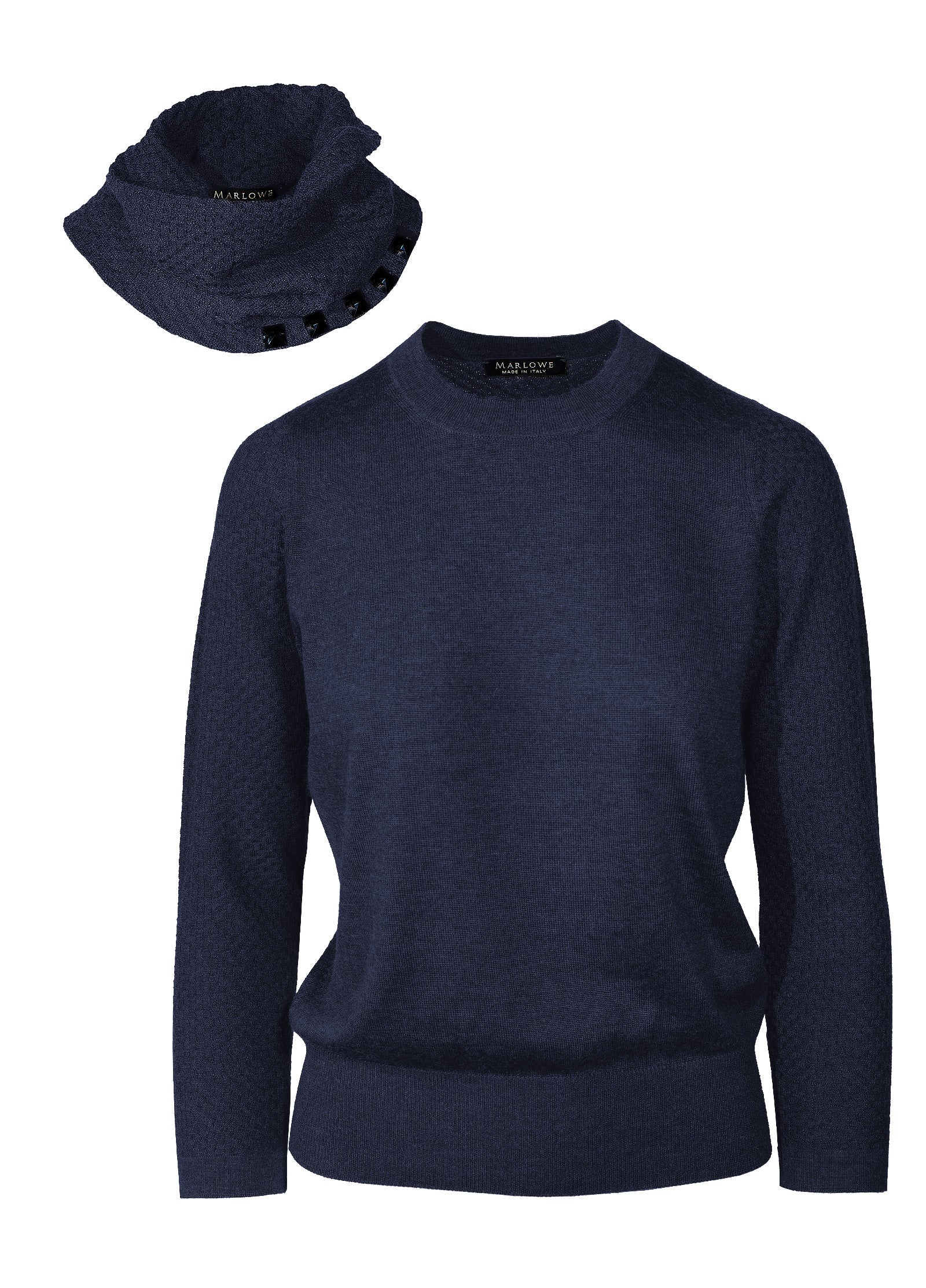 Cashmere ultra fine quadrato texture crew neck sweater and beaded funnel scarf.
